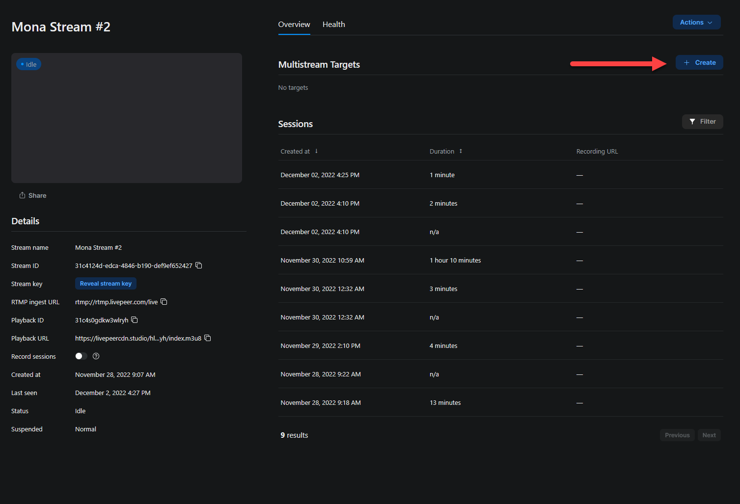 * Once you have created a new Stream in Livepeer you can see a section to the right called multistream. Select the 'Create' button.
