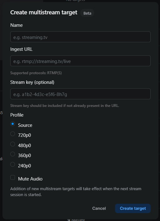 * Profile - This covers the resolution of the stream to the destination