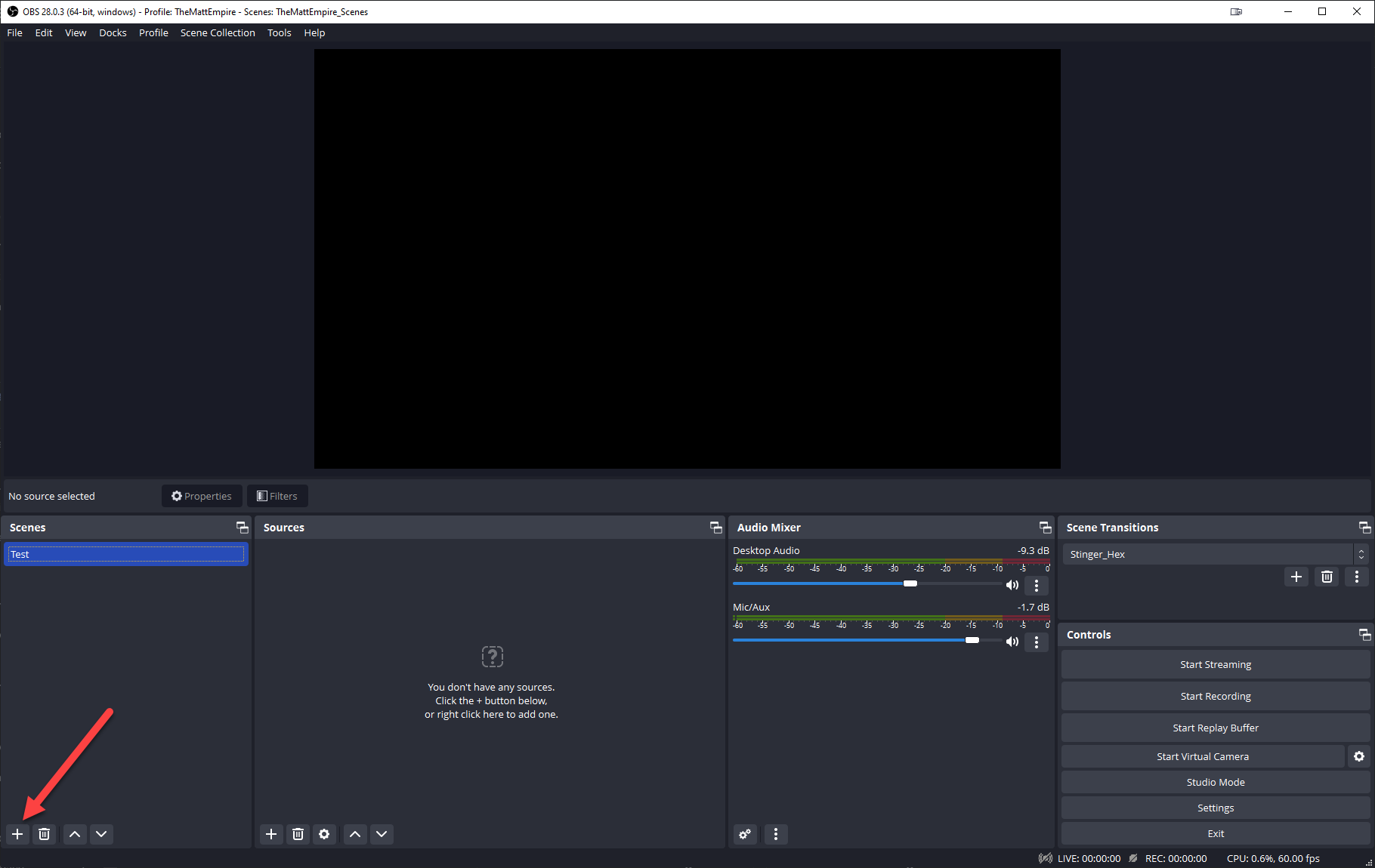 * Add and label a Scene to the 'Scenes' category. This will hold all the different elements, called Sources, such as a webcam or desktop in it. It is possible to have multiple Scenes, and transition between them with simple fades or swipes, or even custom transitions that you make.