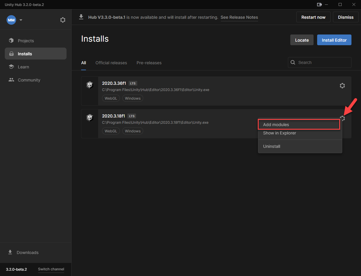<figure><img src="https://3438761929-files.gitbook.io/~/files/v0/b/gitbook-x-prod.appspot.com/o/spaces%2F-MkgZbQzoznBJC_ld633%2Fuploads%2FIsBjyJrKkK8OONJ281WY%2Fimage.png?alt=media&#x26;token=e0ddba33-c100-4f6f-96c5-73034791272e" alt=""><figcaption><p>Adding Modules to Unity Hub</p></figcaption></figure>