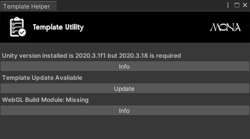 The Template SDK Utility Is a tool that helps make sure that you have the right version of Unity, WebGL is installed, and the latest version of the Mona Template SDK installed.