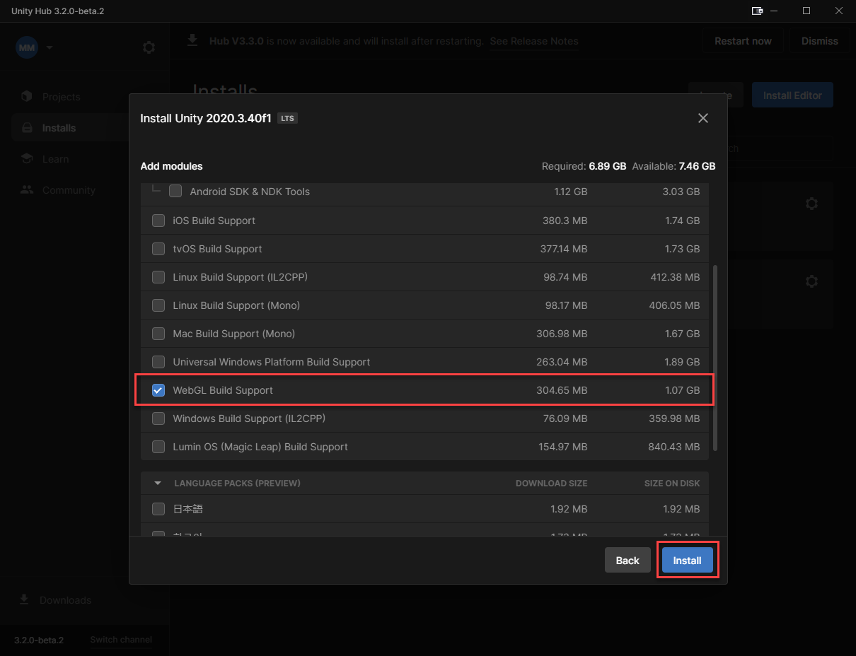 After that you need to make sure the WebGL module is installed. By selecting the toggle and selecting 'Install' at the bottom.