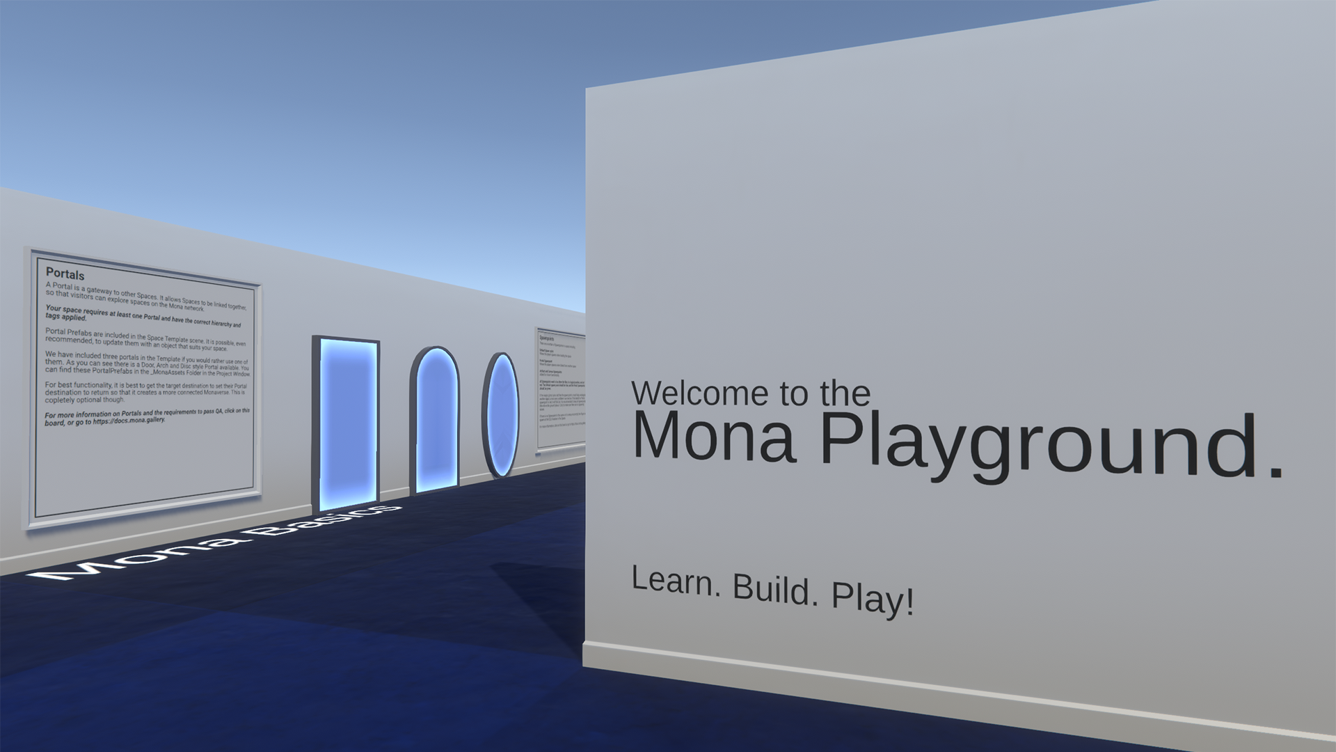 The Mona Playground is a Mona Space that showcases the features of Mona and how to get the best results from your creations. It includes simple examples of colliders and lightmapping, through to a lot of the Mona Library assets in world to see how they work.